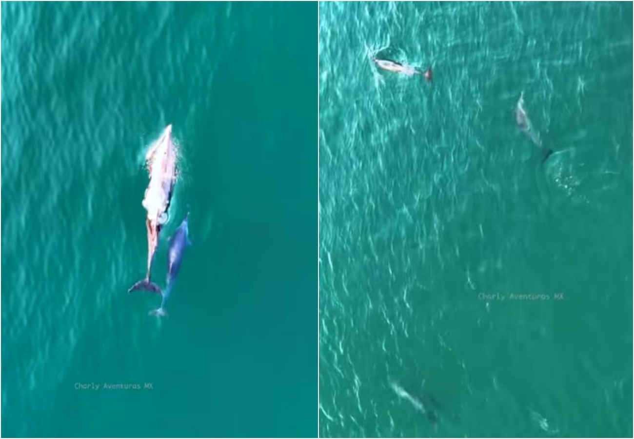 Posteriormente, su dron mostró cómo algunos ejemplares se reunieron para ir detrás de un pez hasta dar con su cardumen y dedicarse un rato a perseguirlo, sin llegar a comerse a los peces.
