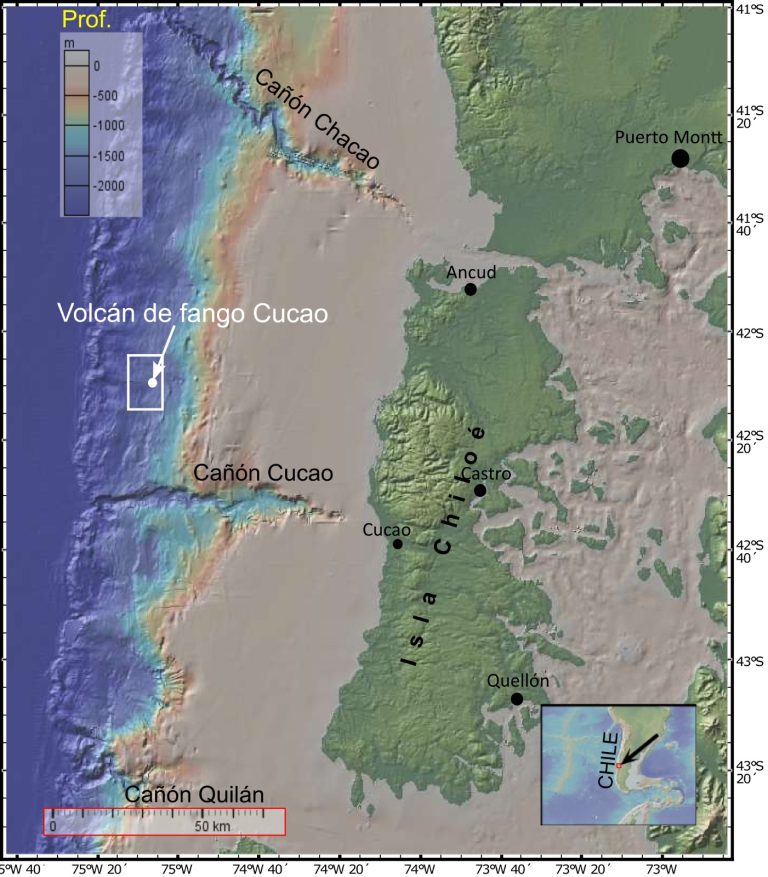 Investigadores de la Universidad Andrés Bello (UNAB) localizaron un volcán de lodo submarino de 1,5 kilómetros de diámetro cerca de la isla Grande de Chiloé, en la región de Los Lagos.