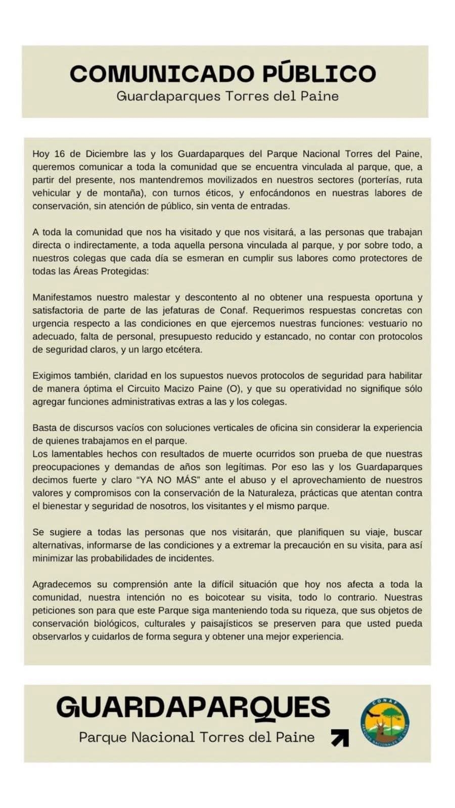 Sumado a esto, inició un paro laboral de los guardaparques. En un comunicado, los trabajadores expresaron su "malestar y descontento al no obtener una respuesta oportuna de parte de las jefaturas de Conaf”.