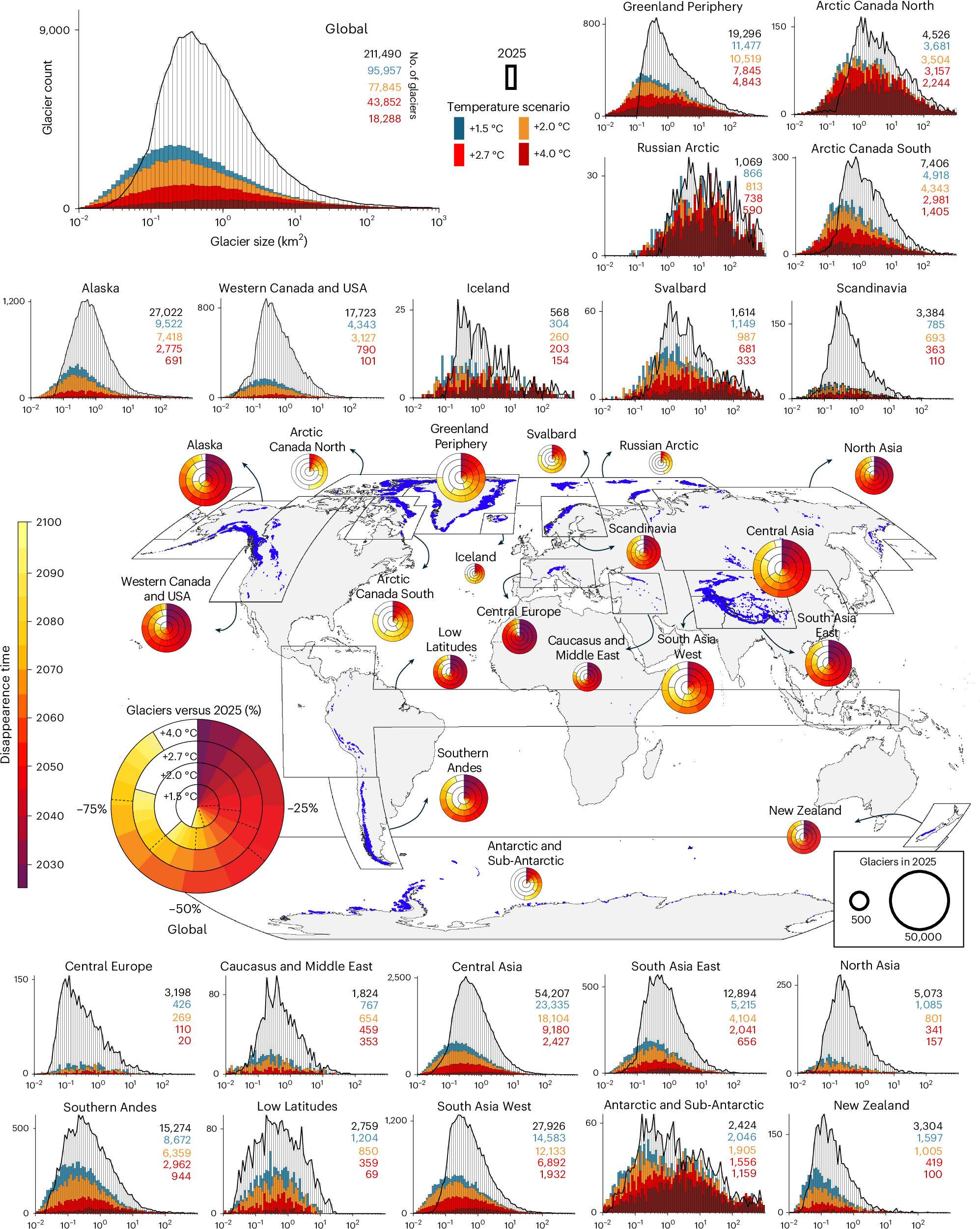 A escala global la proyección de cara al inicio del nuevo siglo es similar. Alrededor de 95.000 soportarían en el mejor de los casos (1,5°C). No obstante, la cantidad de estas masas de hielo y nieve podría totalizarse en poco más de 18.000 (4°C).