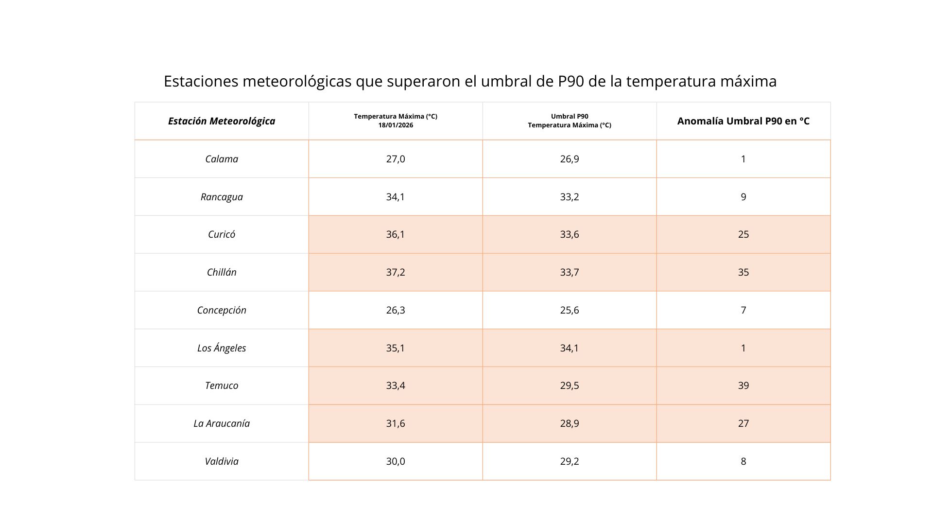 Aunado a esto, se reveló que hubo “anomalías térmicas positivas y condiciones de calor extremo para la época”, las cuales superaron el umbral P90 en “diversas estaciones del país”, entre las regiones de Atacama y Los Ríos.