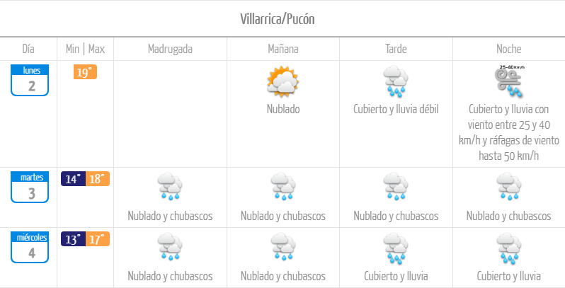 Las ciudades de Villarrica y Pucón esperan una lluvia débil vespertina el lunes 2. Pasará a ser moderada en la noche, cuando aparecerá viento de entre 25 y 40 km/h y ráfagas de hasta 50 km/h.