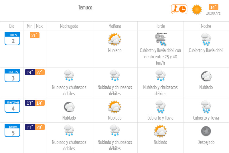 El miércoles 4 lloverá de manera generalizada, durante diversos momentos de la jornada. Finalmente, el jueves 5 de febrero los últimos chubascos se manifestarán en Temuco, finalizando por la tarde en Angol.