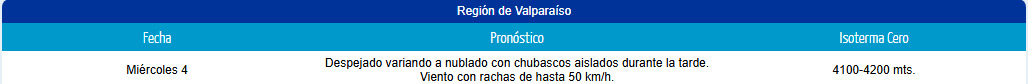 El pronóstico oficial de la DMC indica que la región de Valparaíso, la Región Metropolitana y la región de O’Higgins tendrán goterones vespertinos, con ráfagas de hasta 50 km/h.