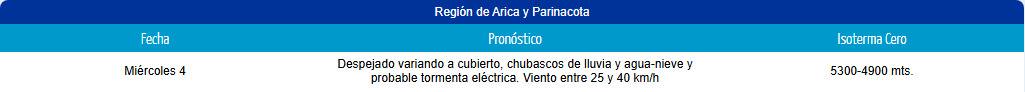 La región de Arica y Parinacota tendrá chubascos líquidos y de aguanieve, probables tormentas eléctricas y viento de entre 25 y 40 km/h.