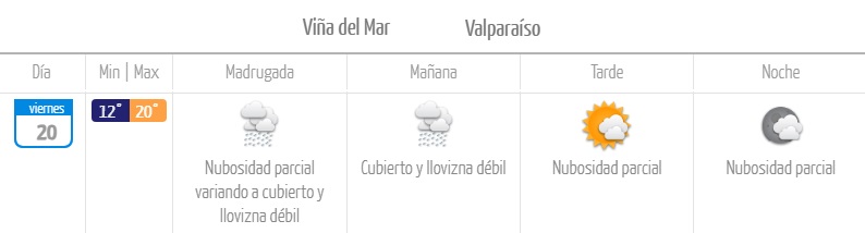 - Viña del Mar y Valparaíso: 12°C (mínima) y 20°C (máxima)