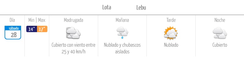 Durante la mañana del próximo sábado 28 de febrero, habrá chubascos aislados por la mañana en Lota y Lebu, antecedido por viento de entre 25 y 40 km/h.