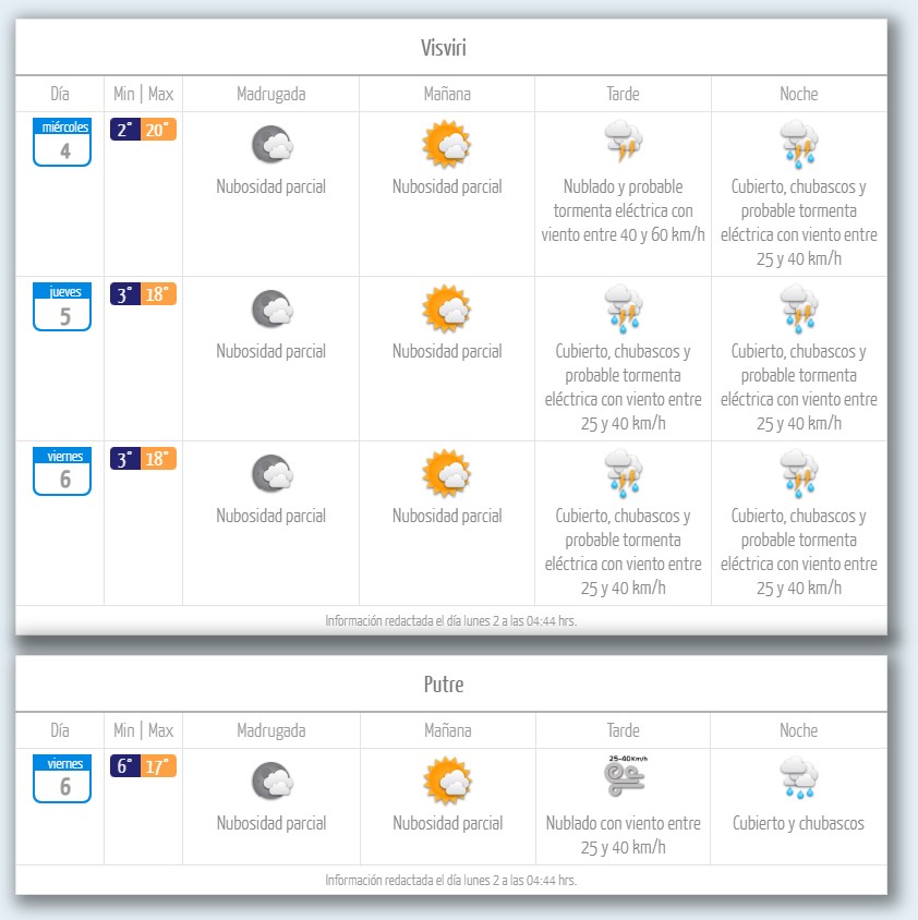 Las tardes y noches del miércoles, jueves y viernes avanzarán con chubascos, viento de 25 a 40 km/h y probables tormentas eléctricas en Visviri, región de Arica y Parinacota, según la Dirección Meteorológica de Chile (DMC).