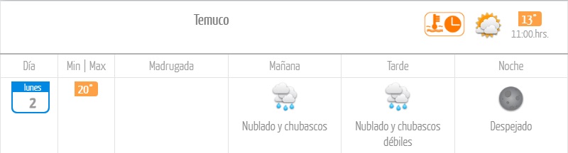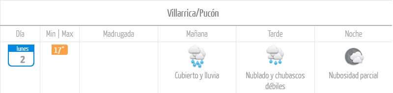 La Dirección Meteorológica de Chile (DMC) pronosticó chubascos en la región de La Araucanía para los días lunes 2 y martes 3 de marzo, debido a los efectos de dos sistemas frontales.