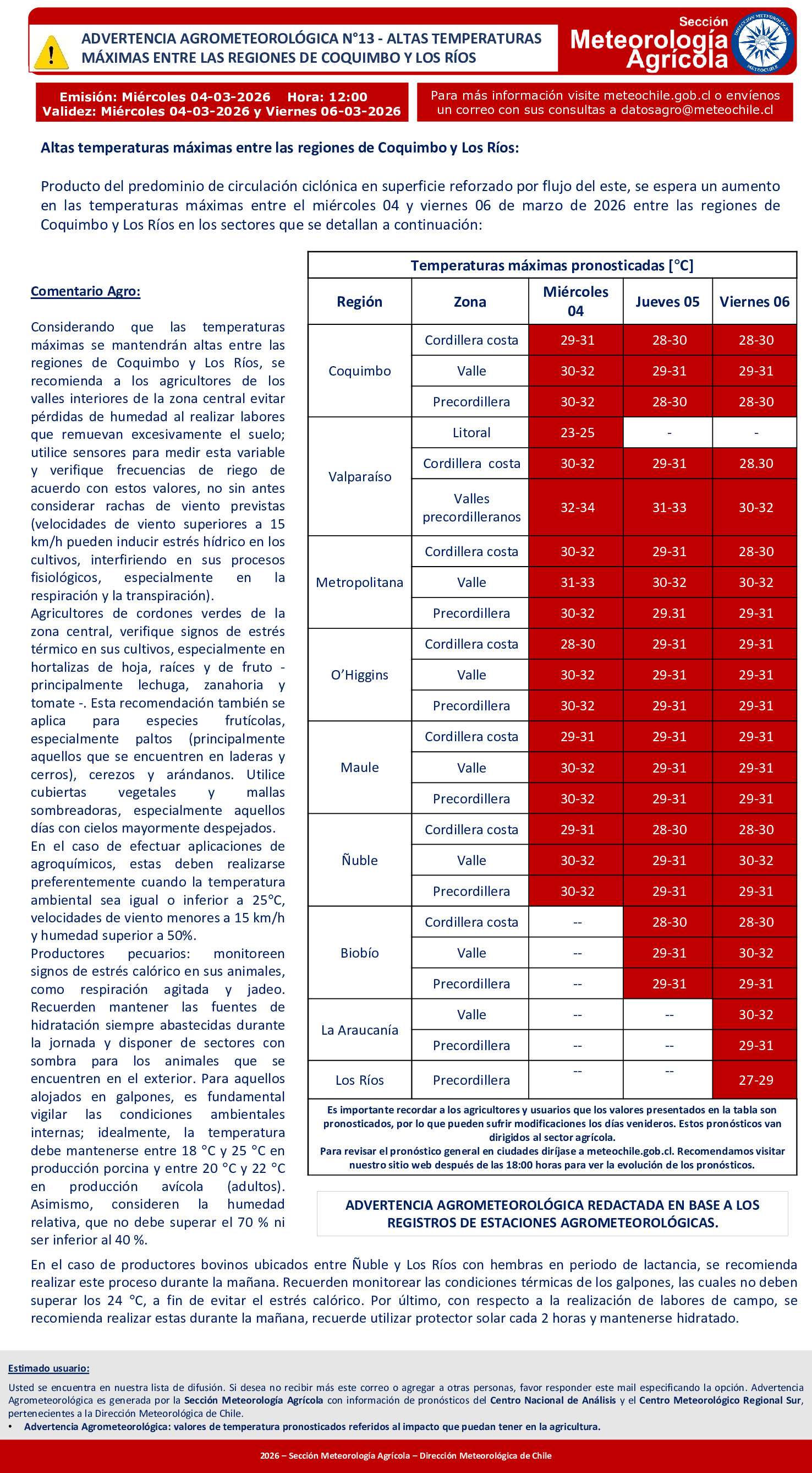 Por otra parte, las máximas marcarán hasta 31°C a 32°C en la cordillera de la costa, valles y precordillera de las regiones de Coquimbo, O’Higgins, Maule y Ñuble.