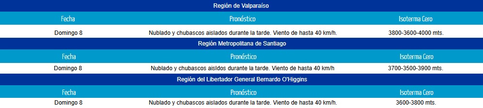 A su vez, se prevén chubascos aislados durante la tarde, en los sectores cordilleranos de la región de Valparaíso, Región Metropolitana y la región de O'Higgins.