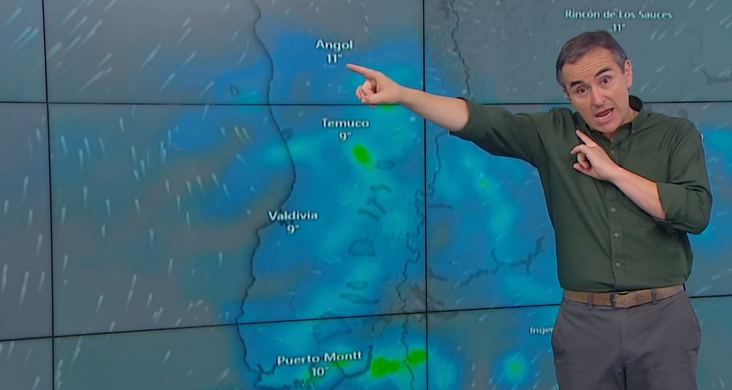 El comunicador reiteró que “en la mañana estará la probabilidad no de una lluvia homogénea, sino de chubascos, con probables tormentas eléctricas en sectores costeros de Biobío, La Araucanía y Los Ríos".