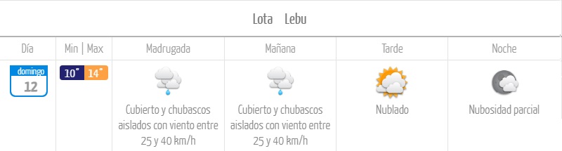 Lota y Lebu tendrían la mañana más fría del fin de semana, dado que los termómetros caerían a 9°C el sábado. Por el contrario, la tarde más cálida la registrarán en Los Ángeles, donde habrá hasta 20°C ese día.