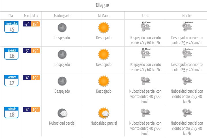 A la par de estas temperaturas extremas, brillará el sol en Ollagüe. Por la tarde se sumará viento de 40 a 60 km/h, que declinará a velocidades de entre 25 y 40 km/h en la noche.