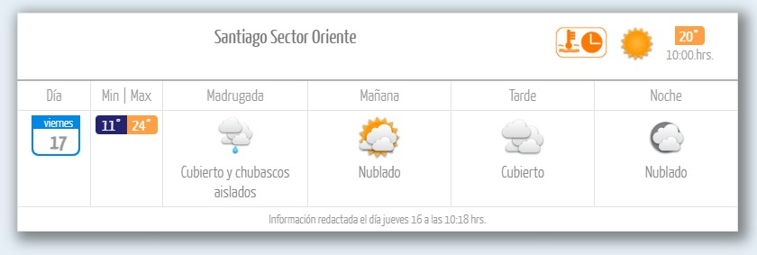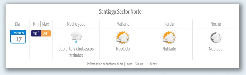 En Santiago, las comunas de Colina y San José del Maipo recibirán chubascos aislados, acompañados de cielos cubiertos, durante la madrugada de este viernes. Lo mismo ocurrirá en los sectores norte, oriente y sur.