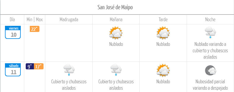 El impacto de un sistema frontal dejará chubascos aislados en San José de Maipo, donde caerá agua hasta la mañana del sábado 11 de octubre. Posteriormente predominará la nubosidad.