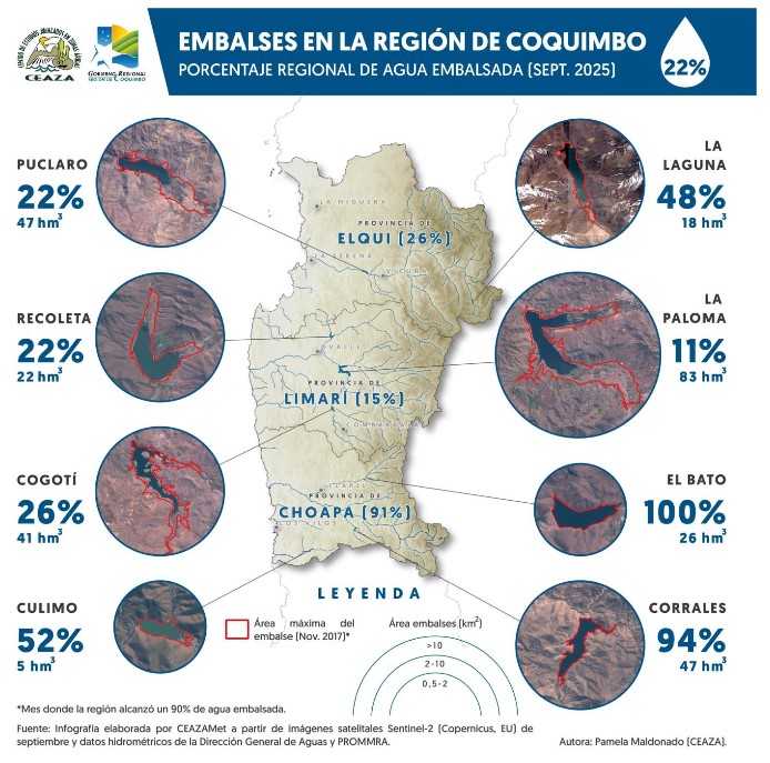 A través de su boletín climático, el Ceaza detalló que las provincias de Elqui, Limarí y Choapa presentan una cantidad de agua embalsada equivalente al 26%, 15% y 91% de su capacidad máxima, respectivamente.