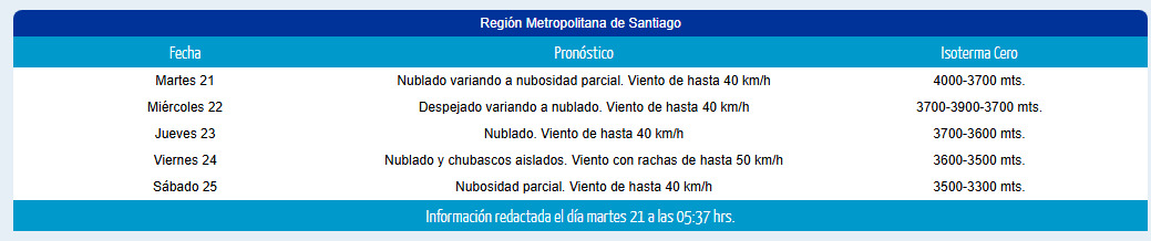La Dirección Meteorológica de Chile (DMC) oficializó la llegada de chubascos y rachas de viento de hasta 50 km/h, durante la jornada de este viernes 24 de octubre, en la cordillera de la Región Metropolitana.