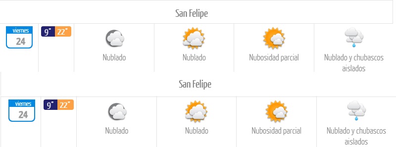 Al anochecer de este viernes 24 de octubre se prevén chubascos aislados, puntualmente en las comunas de San Felipe y Los Andes.