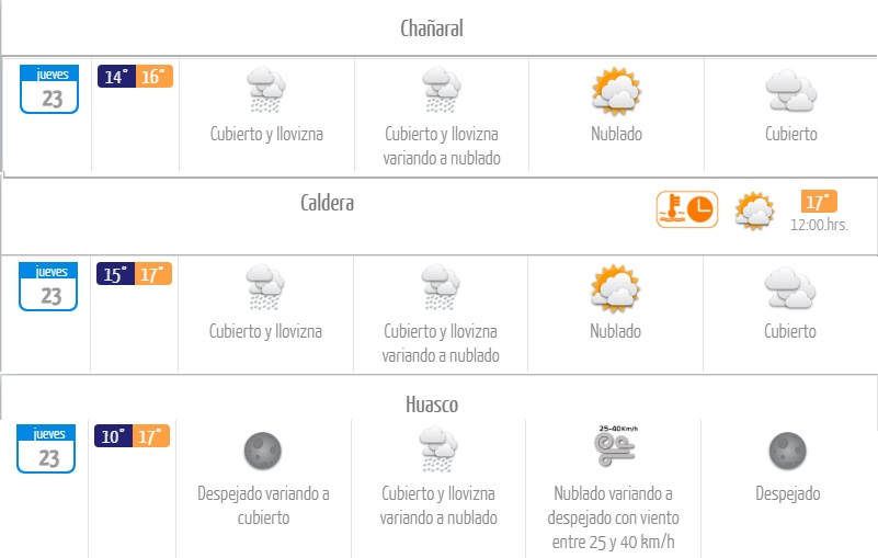 - Chañaral: 14°C (de mínima) y 16°C (de máxima).