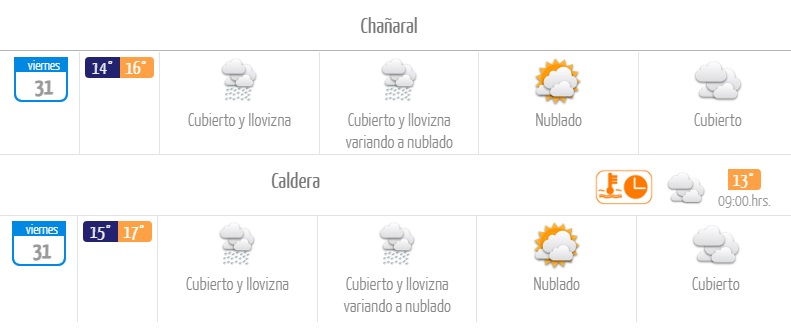 - Chañaral: 14°C (de mínima) y 16°C (de máxima).