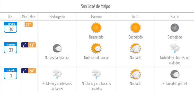 - San José de Maipo: entre 7°C (de mínima) y 20°C (de máxima).