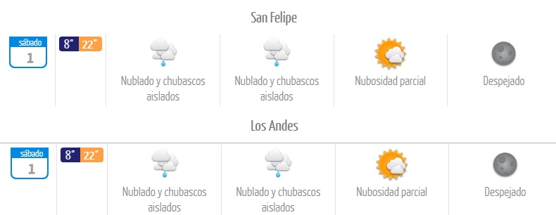 La jornada del sábado 1 de noviembre se registrarán chubascos de tendencia aislada en San Felipe y Los Andes. Aparecerán por la madrugada y se extenderán hasta el mediodía.