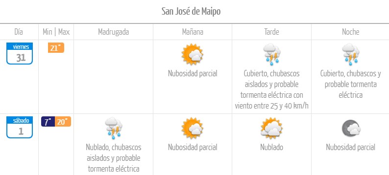 Por otra parte, en San José de Maipo los chubascos se mantendrán hasta un horario similar, aunque iniciarán desde la tarde del viernes y estarán acompañados por la probabilidad de tormentas eléctricas.