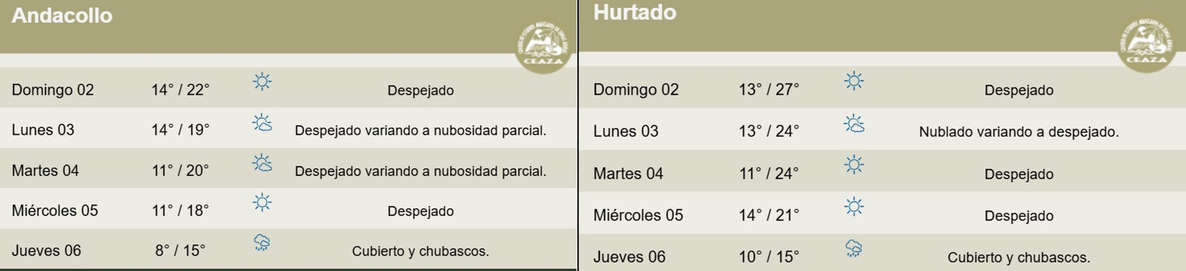 Andacollo, Hurtado, Pichasca, Samo Alto, Rapel, Combarbalá e Illapel tendrán cielo cubierto y chubascos este jueves. Mientras que en Huintil anuncian lluvia débil.