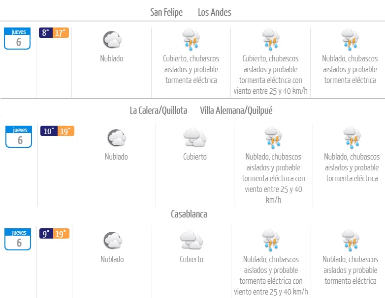 Así está previsto en las comunas de San Felipe y Los Andes, La Calera, Quillota, Villa Alemana, Quilpué y Casablanca. Los mayores efectos aparecerán en la tarde.