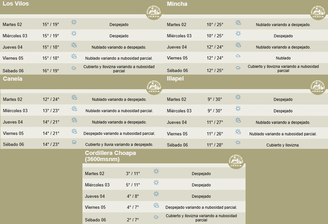 El Ceaza prevé que las precipitaciones se extenderán a la provincia de Choapa hacia el sábado. Recibirán lloviznas en Los Vilos, Mincha, Illapel y la cordillera (3.600 msnm), mientras que en Canela se avista lluvia.