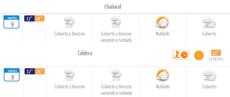 El martes habrá lloviznas matutinas en Chañaral y Caldera. Por su parte, en Huasco se prevé viento de entre 25 y 40 km/h por la tarde-noche.