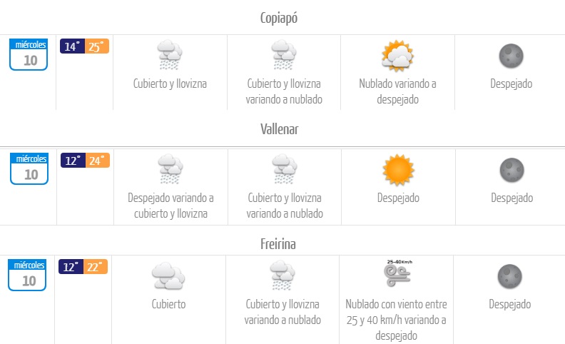 Durante la jornada del miércoles, las precipitaciones aparecerán en las localidades de Copiapó y Vallenar durante las primeras 12 horas del día. En Freirina se prevén sólo por la mañana.