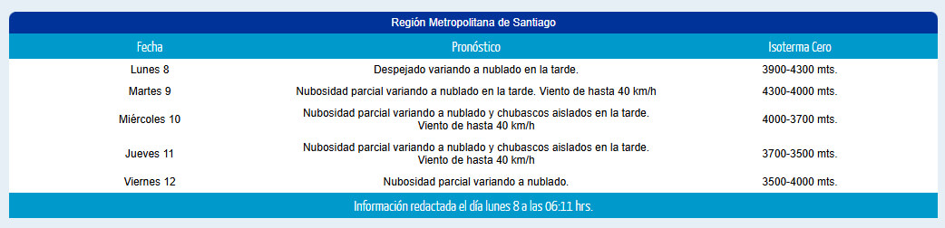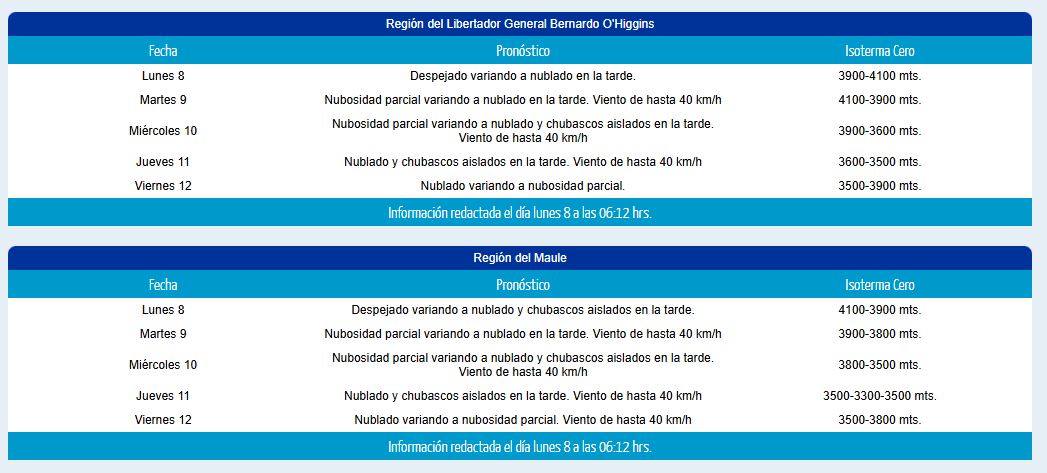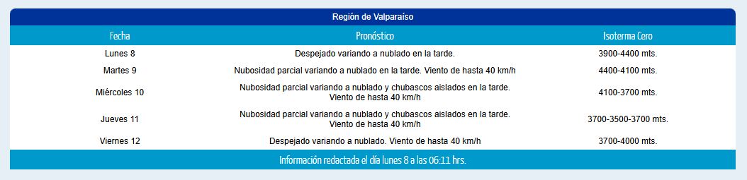Las regiones de Valparaíso, O'Higgins y Maule también recibirán chubascos aislados por la tarde y viento de hasta 40 km/h en la cordillera durante los próximos 10 y 11 de diciembre.
