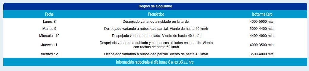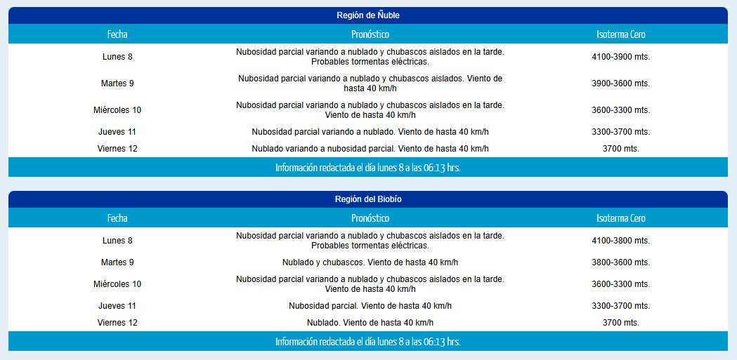 Por su parte, las regiones de Ñuble y Biobío igualmente esperan ambos fenómenos en este sector el miércoles. Mientras que Coquimbo tendrá chubascos aislados y viento con rachas de hasta 50 km/h solamente el jueves.