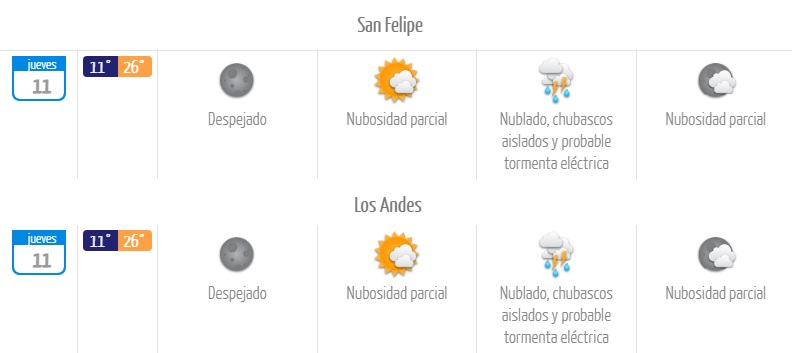 En cuanto a la temperatura, San Felipe y Los Andes presentarán las extremas más pronunciadas de la región, con rangos de entre 11°C y 26°C.