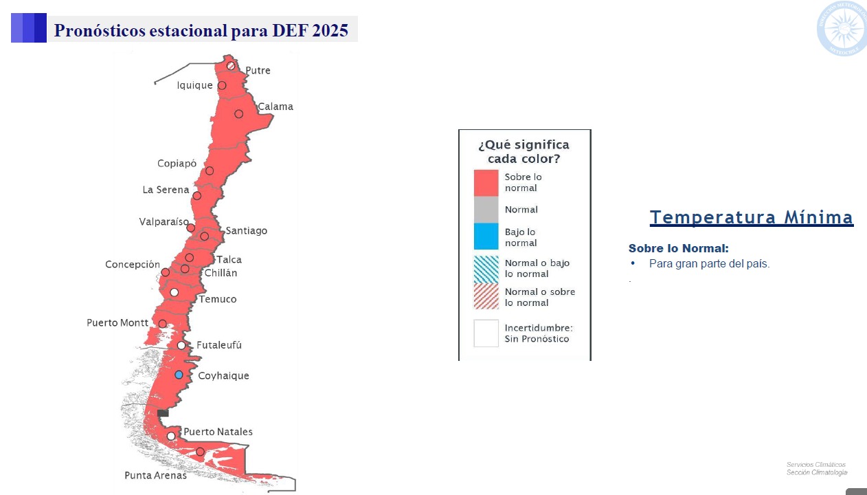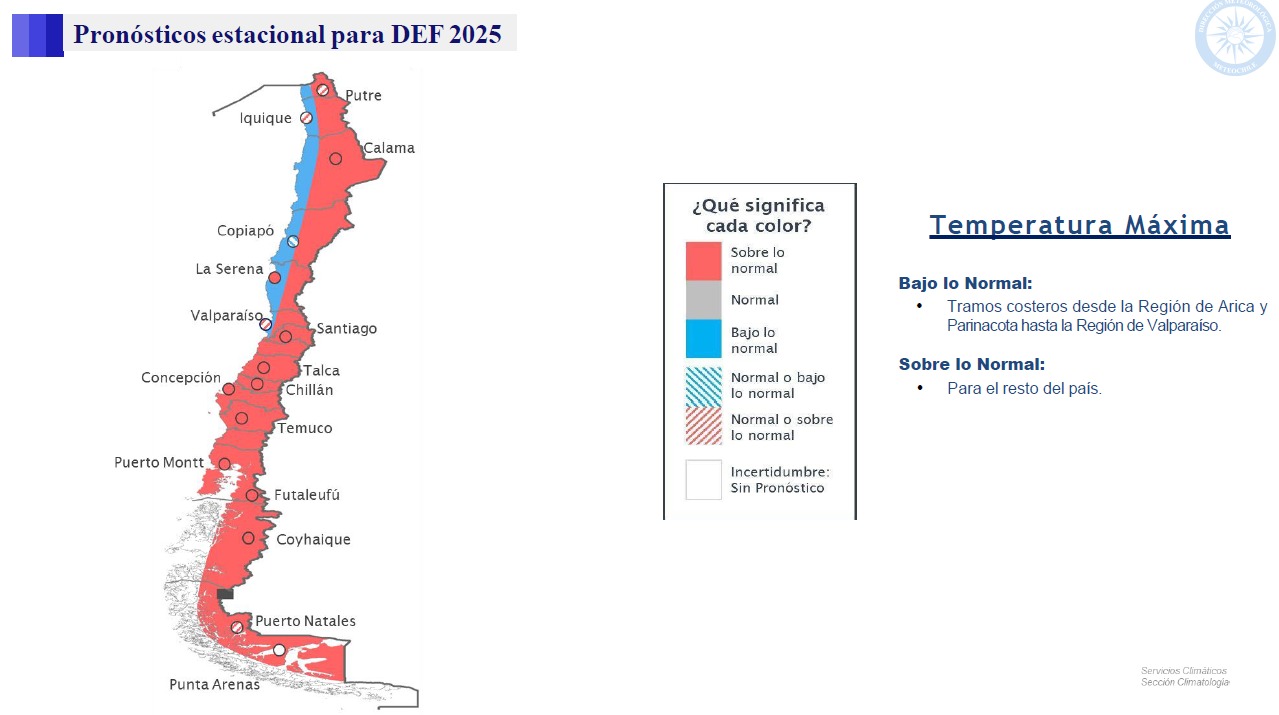 De igual forma, las máximas serán superiores a la media, con excepción de los sectores de costa desde la región de Arica y Parinacota hasta la región de Valparaíso, donde serían inferiores a lo común para la época.