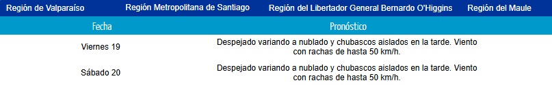 En la región de Valparaíso, Región Metropolitana, O’Higgins y Maule aparecerán chubascos de tendencia aislada en la tarde, junto a los vientos antes descritos.