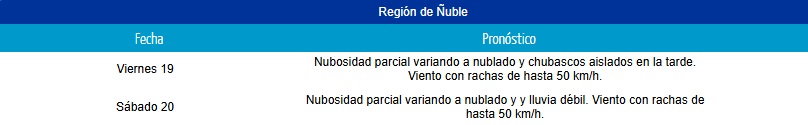 Para el Ñuble habrá goterones el viernes, con una lluvia débil que aparecerá a la jornada siguiente y corrientes de aire de hasta 50 km/h ambos días.