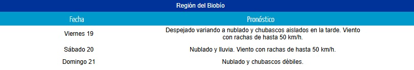 Finalmente, en el Biobío se prevén chubascos aislados el viernes y lluvia el sábado. Las precipitaciones seguirán incluso hasta el domingo, con la caída de algunas gotas.