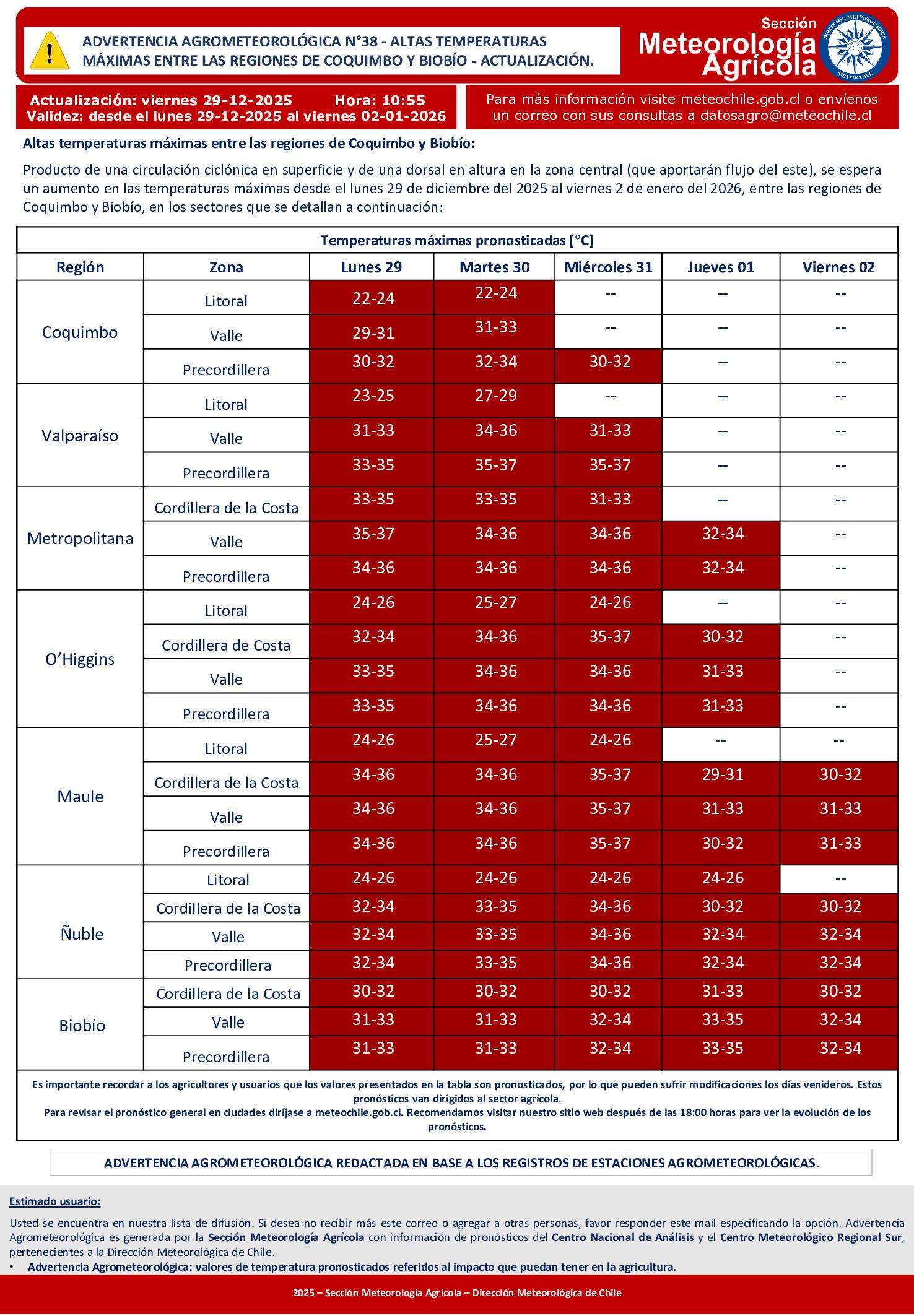 Debido a ello, el organismo emitió una nueva advertencia agrometeorológica, válida para sectores de las regiones de Coquimbo, Valparaíso, Región Metropolitana, O’Higgins, Maule, Ñuble y Biobío.