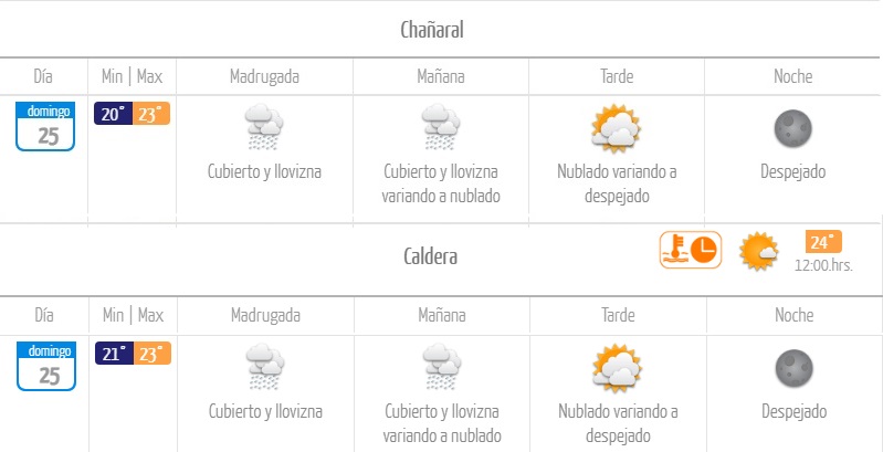 Las temperaturas máximas rondarán los 23°C en Chañaral y los 24°C en Caldera el sábado, para mantenerse cercano a los valores el domingo.